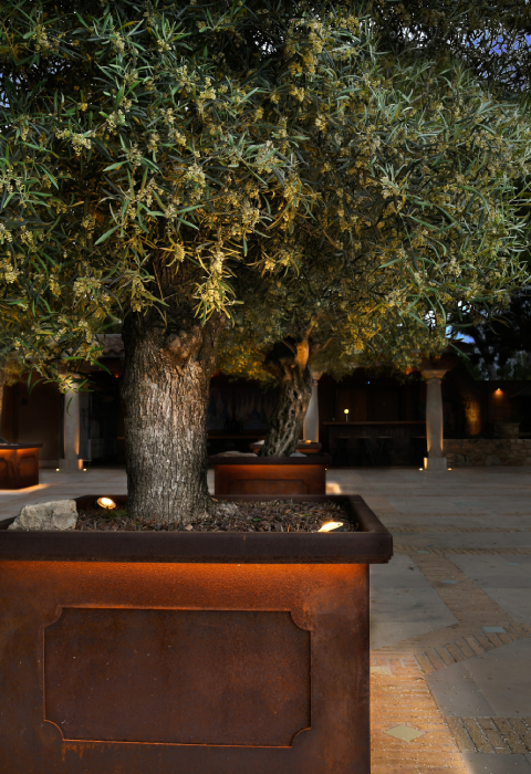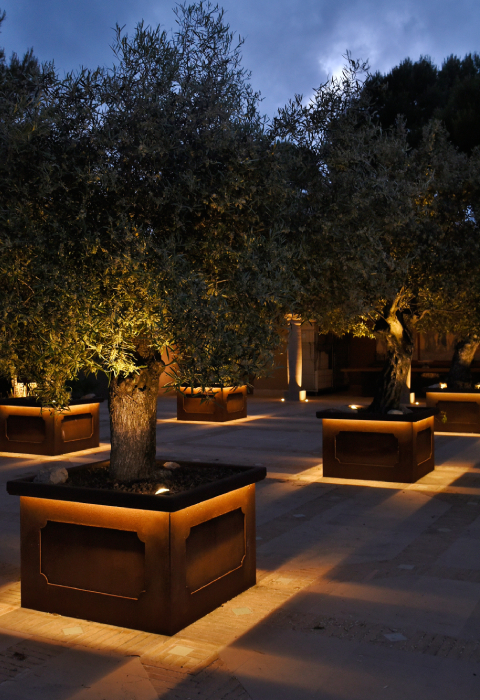 - Bambola: este proyector acompaña a las tiras LED de los maceteros para destacar, con una iluminación de acento, la copa de los olivos;