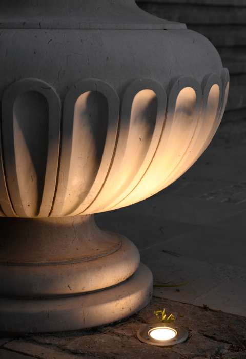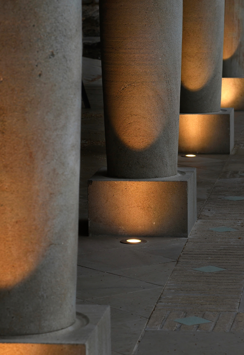 - Estambul con el empotrable de suelo Estambul se destacan las columnas y los maceteros de piedra de la entrada principal y alrededores. El efecto lumínico que se genera da un aire dramático al espacio;