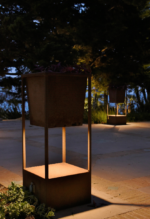 - Tira LED: con tiras LED se ilumina el perímetro de las jardineras. Se resaltan los volúmenes a la vez que se crea un efecto lumínico suave en el suelo que provoca un cierto efecto de ingravidez;