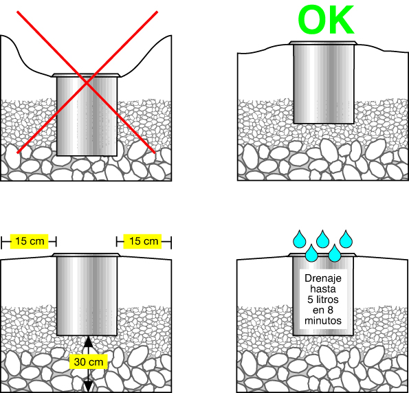 2. Drenaje eficaz: realizar un drenaje con arena de gravilla de 25 a 30 mm es indispensable para evitar el estancamiento de agua en el fondo del surco donde se instalan las luminarias. Un drenaje correcto debe permitir la absorción de 5 litros de agua en 8 minutos.