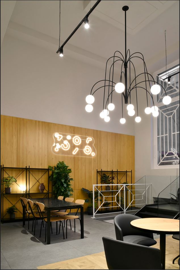 El corazón del proyecto se encuentra en la zona central de doble altura, donde diseñamos e instalamos unas impactantes arañas de gran formato, compuestas por múltiples brazos metálicos curvados en acabado negro mate, que sostiene esferas opalinas de luz cálida. La composición simula una cascada luminosa, generando así una atmósfera envolvente y acogedora.