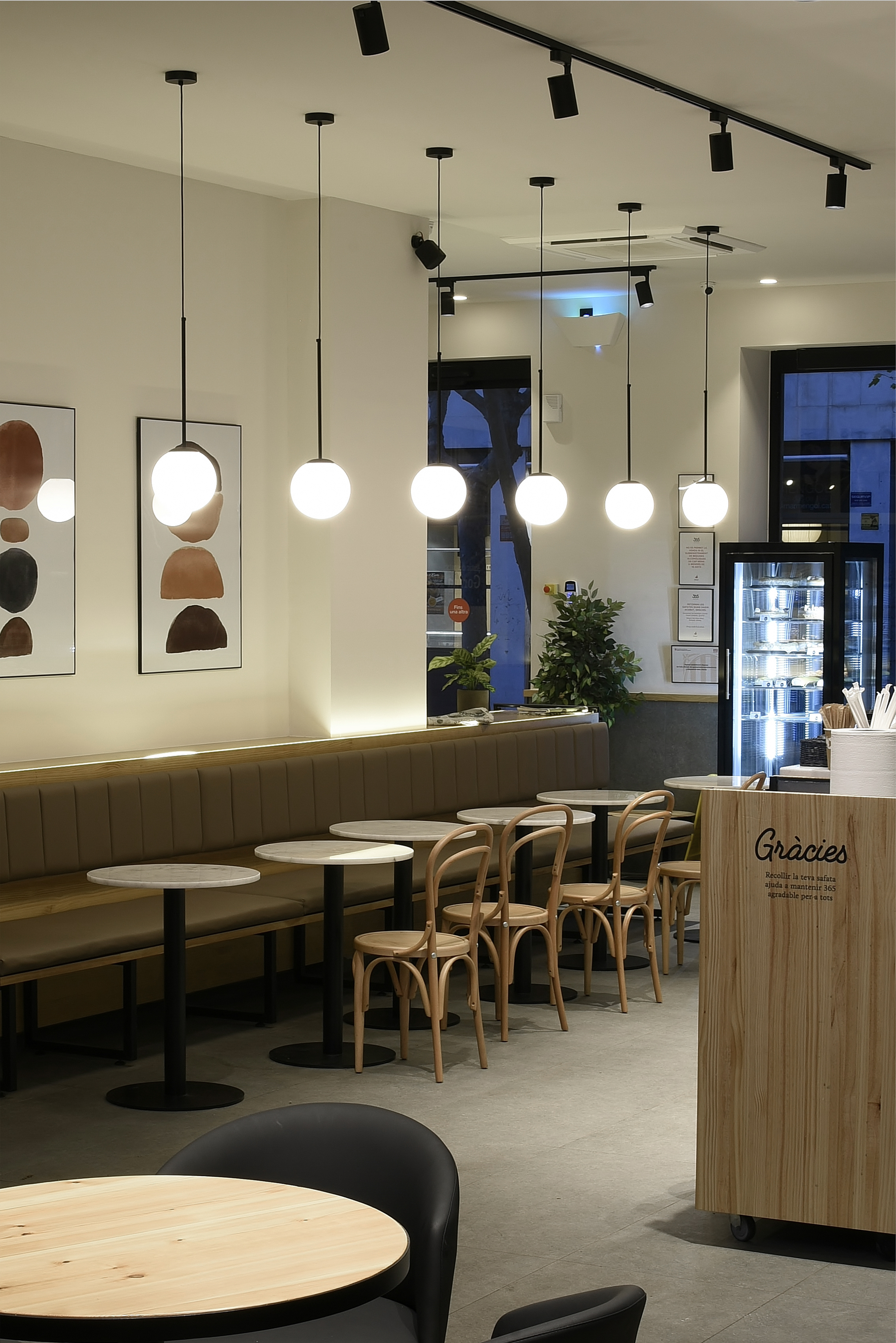 Coherencia y adaptación, versiones personalizadas para cada zona. En las zonas mas bajas del local, como los rincones laterales y el área junto a los ventanales, desarrollamos una segunda versión del mismo concepto lumínico: lámparas de suspensión individuales con una sola esfera y un mismo lenguaje formal.