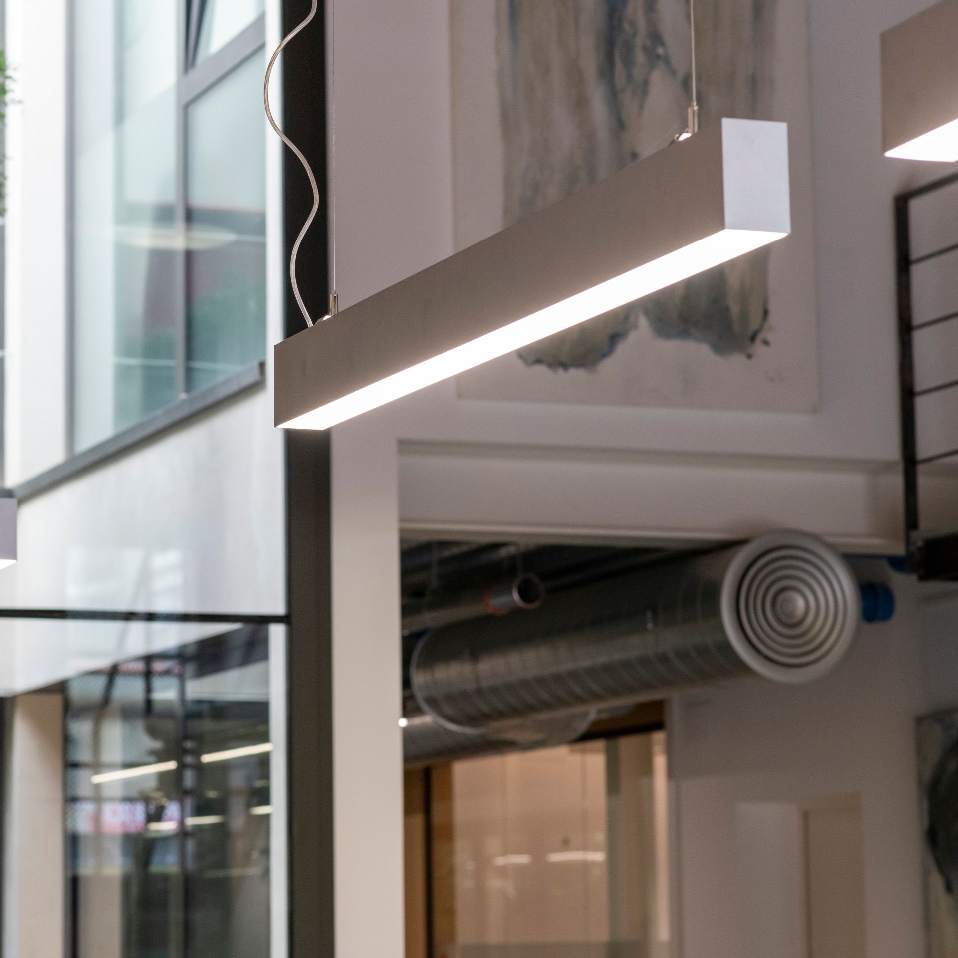 Zonas de trabajo y atención al público: se instalaron luminarias lineales Fenix, que proporcionan una iluminación continua y uniforme, reduciendo sombras y mejorando la visibilidad sobre los puestos de trabajo.