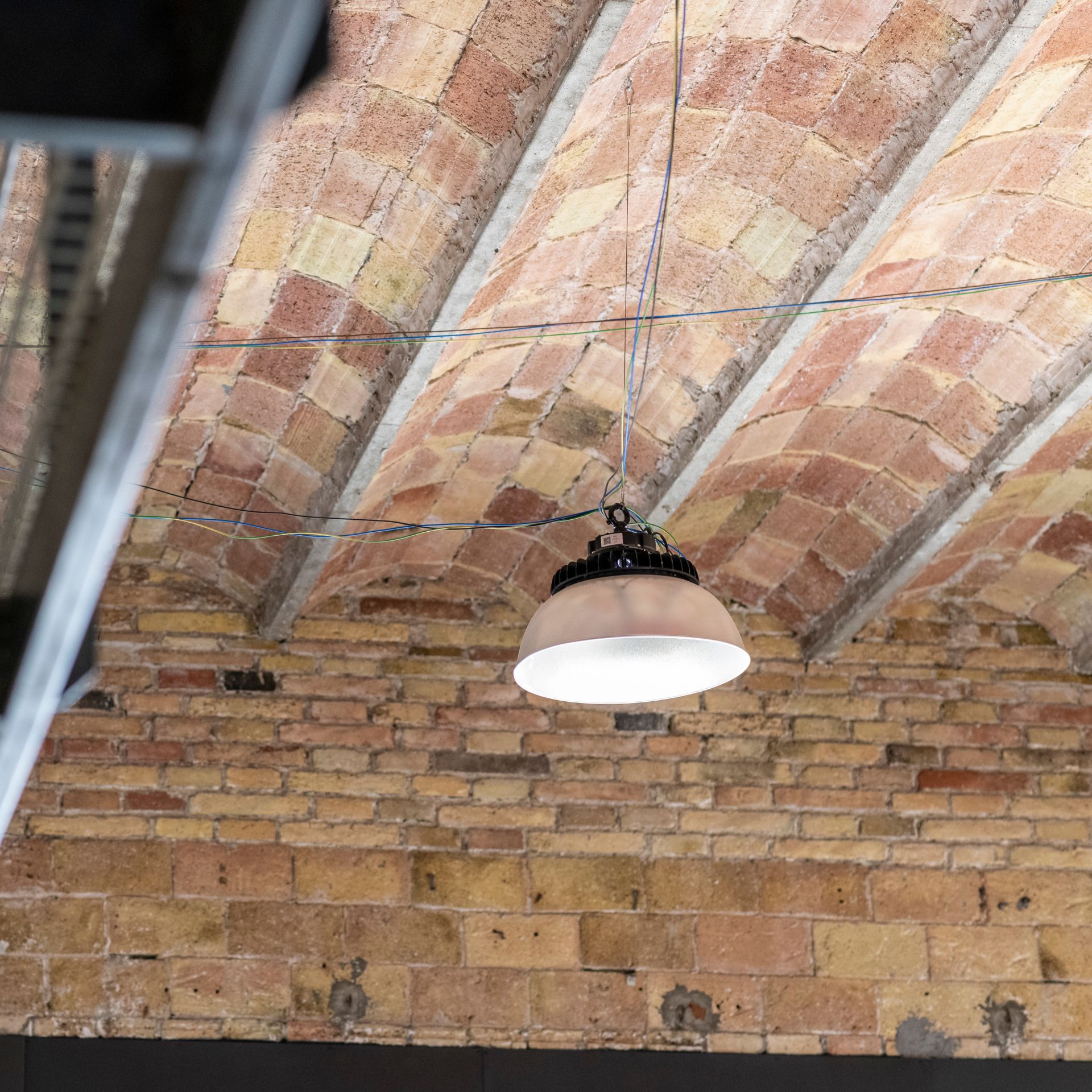 Se diseñó teniendo en cuenta la arquitectura original del espacio, caracterizada por techos de bóveda catalana, paredes de ladrillo visto y elementos metálicos vistos que aportan un estilo industrial y elegante. Las luminarias se integraron de manera armónica, respetando la estética del lugar y mejorando la percepción del entorno.